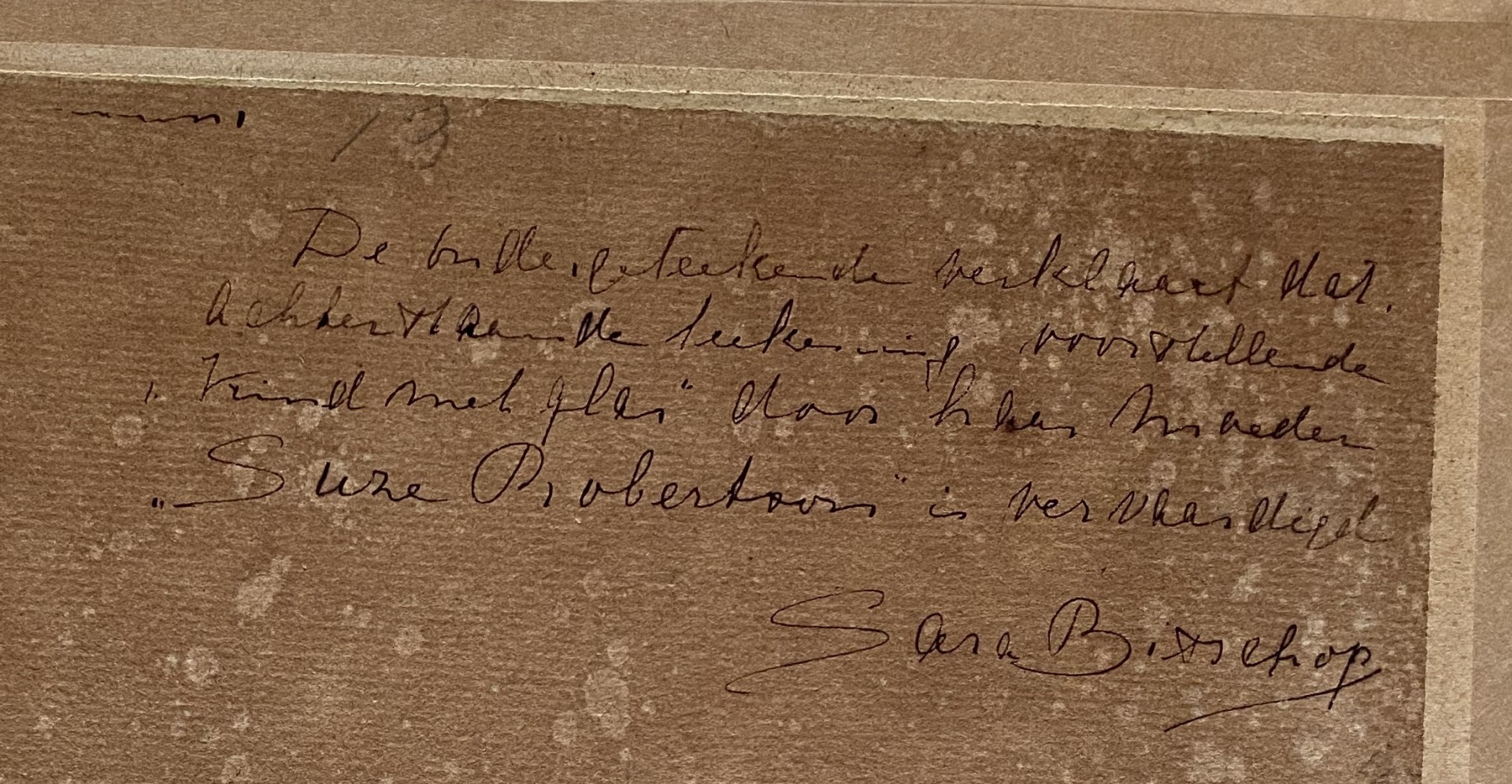 De ondergetekende verklaart dat de achterstaande tekening voorstellende “Kind met glas” door haar moeder Suze Robertson is vervaardigd.