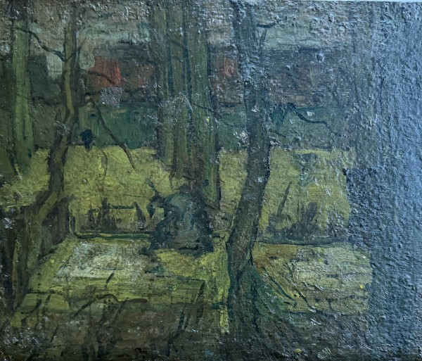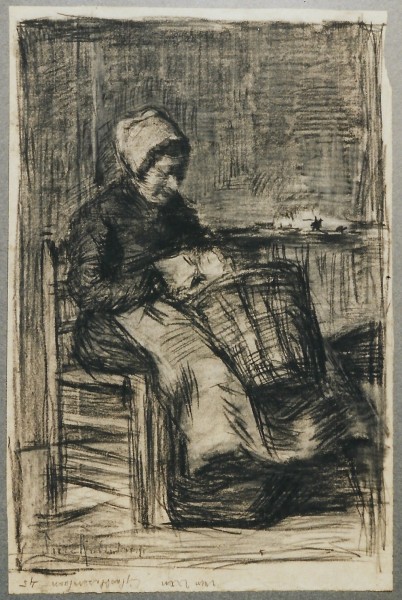 Interieur met een oude vrouw achter een spinnewiel (sri0094)
