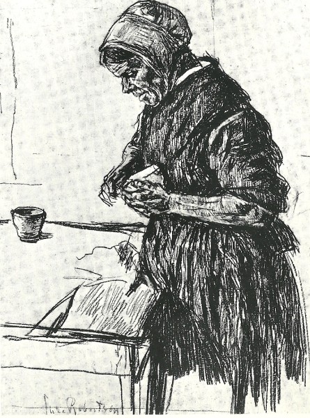 Boerenvrouw schilt aardappelen in een interieur (sri0087)